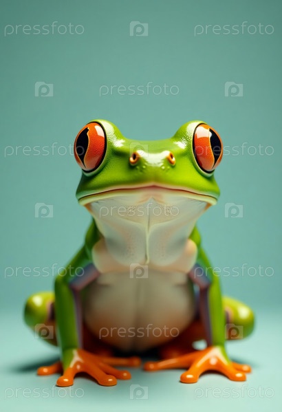 Эта жизнерадостная зеленая лягушка игриво позирует, демонстрируя свои яркие оранжевые глаза и гладкую кожу на мягком пастельном фоне, излучая юмор и обаяние