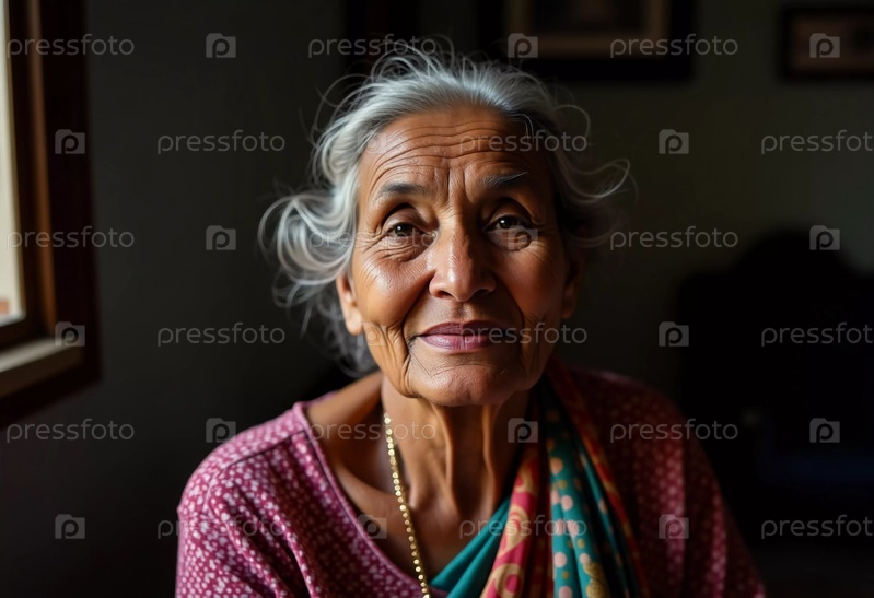 Добродушная пожилая женщина удобно сидит у себя дома, наслаждаясь мягким сиянием дневного света, освещающим ее нежные черты лица и традиционную одежду