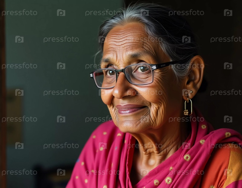 Пожилая женщина из Индии излучает тепло, демонстрируя свой яркий традиционный наряд и очки Генеративный искусственный интеллект