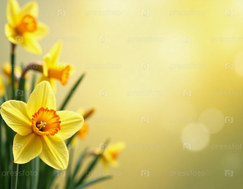 Нежные цветы нарцисса демонстрируют яркие желтые лепестки, украшенные яркими оранжевыми центрами, источающие чувство жизнерадостности. Расположенные среди пышной зеленой листвы, эти цветы мягко покачиваются на теплом ветру, охваченные мягким, мечтательным