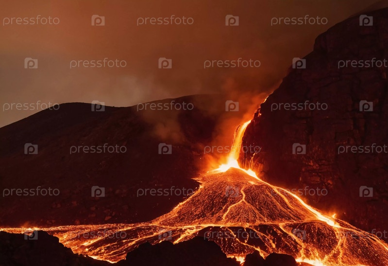 Впечатляющее извержение вулкана освещает ночное небо, а огненная магма стекает по склону горы, создавая захватывающее зрелище первозданной энергии и красоты природы