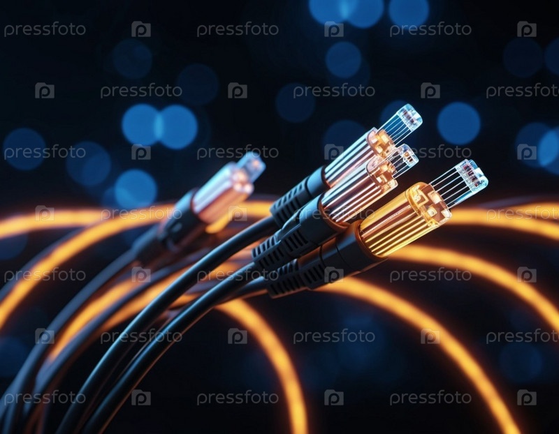 Синие и оранжевые светящиеся провода скручиваются и переплетаются на темном фоне с боке-огнями. Черные кабели и разъемы со светящимися огнями и цепями соединяются, образуя сеть. Создано с помощью ИИ