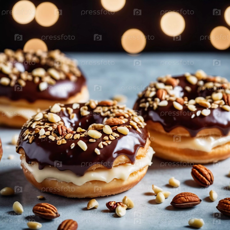 Соблазнительная витрина из пончиков, покрытых шоколадной глазурью и украшенных разнообразными орехами, выставлена на деревенском деревянном столе. Теплое освещение подчеркивает вкусные детали и текстуры угощений. Генеративный ИИ