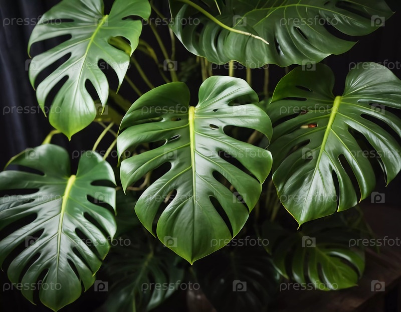 Пышные листья монстеры с замысловатыми вырезами доминируют в пространстве, отбрасывая тени и придавая этому безмятежному внутреннему оазису яркую тропическую атмосферу, приглашая к спокойствию и расслаблению. Генеративный ИИ