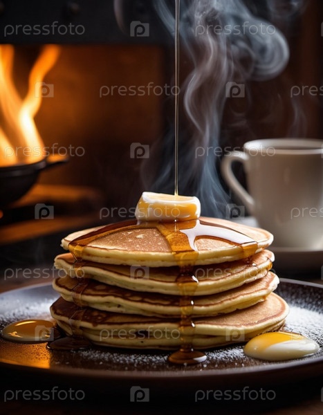 Блины сложены высоко и покрыты щедрой порцией сливочного масла. Сверху поливается теплый медово-кленовый сироп. Притягательный аромат. Ощущение домашнего завтрака. Кухонная сцена. AI