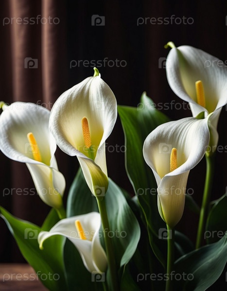 Потрясающая композиция из белых калл с яркими желтыми центрами, окруженная сочными зелеными листьями, создает элегантную цветочную композицию, которая идеально подойдет для любого случая. Генеративный ИИ. Черный фон