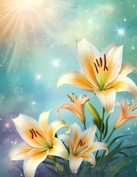 Нежные белые, желтые, оранжевые лилии широко распускают лепестки, обрамленные светящимся сине-зеленым фоном, с мягкими бликами боке и теплыми солнечными лучами, создающими чарующую атмосферу. Генеративный ИИ