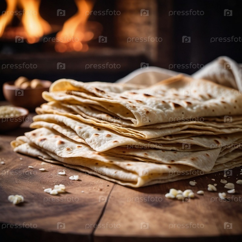 Свежеиспеченная лепешка из лаваша элегантно лежит на деревенской деревянной доске, демонстрируя свою мягкую текстуру и золотисто-коричневые пятна. Теплый огонь потрескивает в очаге, отбрасывая уютное сияние на сцену. Лепешка AI