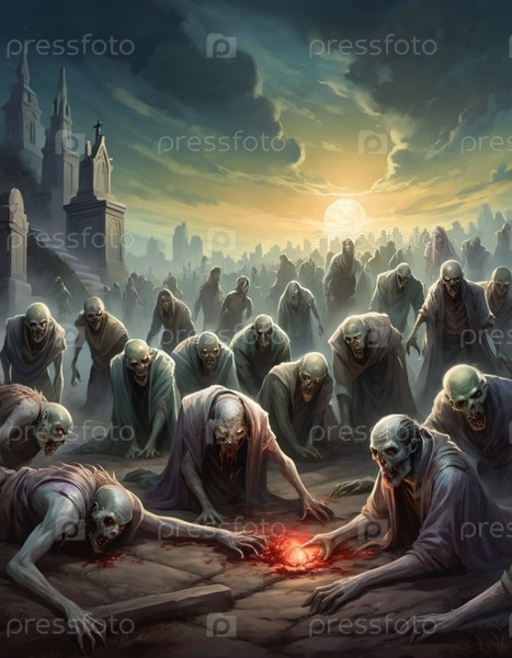 Гротескные зомби появляются из могил, разложившиеся тела освещаются лунным светом. Скелетные фигуры бродят среди надгробий, в то время как другие ползают по земле, демонстрируя свой ужасный вид. ИИ