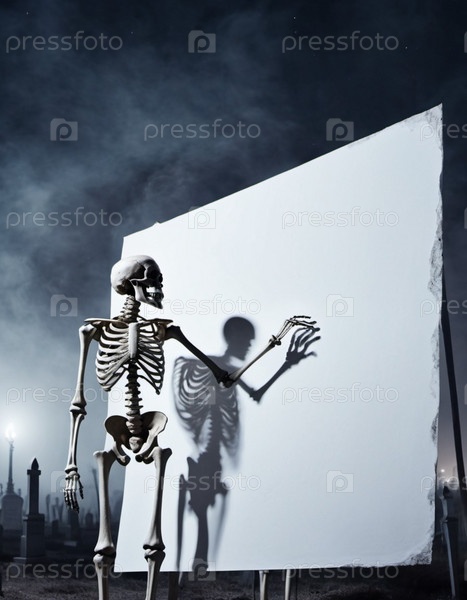 Скелетная фигура стоит, держа в руках пустой белый плакат. Костлявые руки скелета предлагают достаточно места для любого сообщения или дизайна. Скелет предлагает что-то. Тема Хэллоуина. Сгенерировано ИИ
