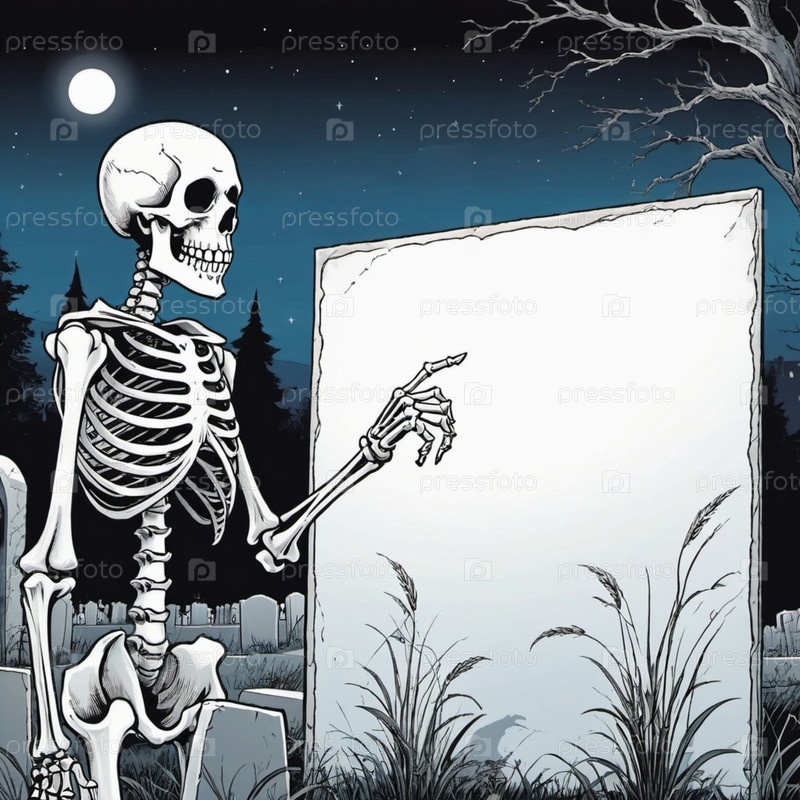 Скелетная фигура стоит, держа в руках пустой белый плакат. Костлявые руки скелета предлагают достаточно места для любого сообщения или дизайна. Скелет предлагает что-то. Тема Хэллоуина. ИИ