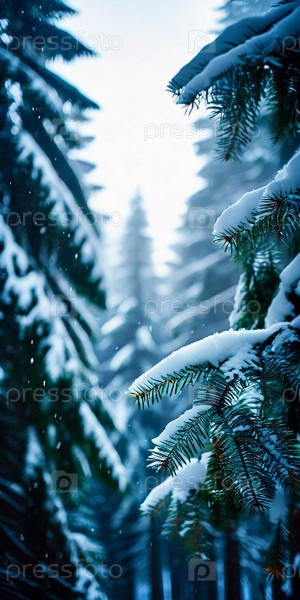 Безмятежный еловый лес, покрытый зимним снегом, демонстрирующий покрытые инеем деревья и мягкий снегопад, создающий спокойную атмосферу в мирной лесной обстановке. Генеративный ИИ