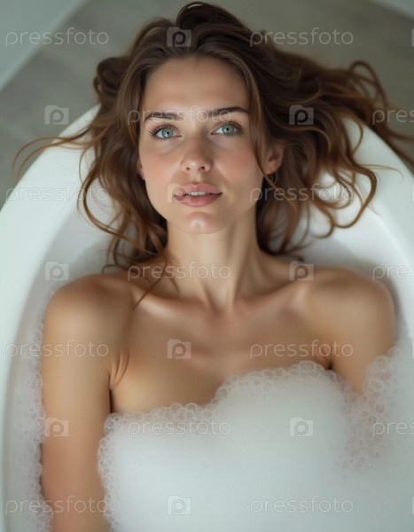 Молодая женщина наслаждается расслабляющей ванной, окруженной мягкой, пушистой пеной, в спокойной обстановке ванной комнаты днем. Генеративный ИИ