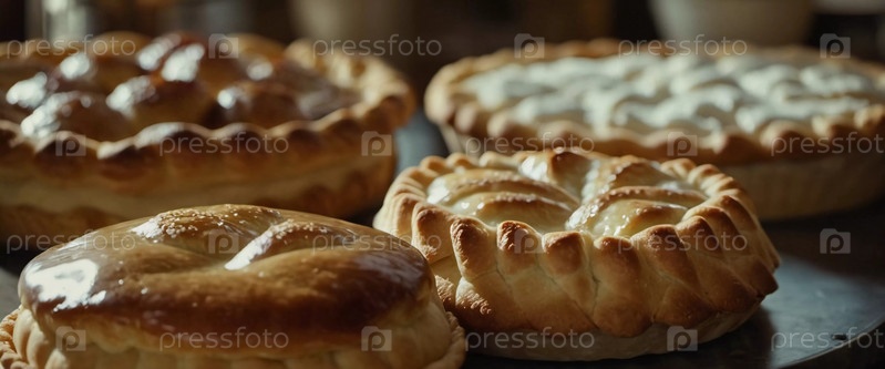 Свежеиспеченные пирожные и пироги красиво разложены на столе в теплой пекарне. Их золотисто-коричневые корочки украшены красивыми узорами, покрытыми сахарной пудрой. Генеративный ИИ