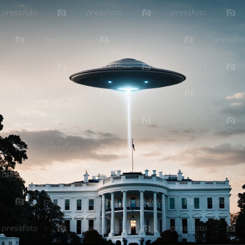Неопознанный летающий объект парит над Белым домом, освещая территорию сфокусированным лучом света. Драматические облака обрамляют сцену. Генеративный ИИ