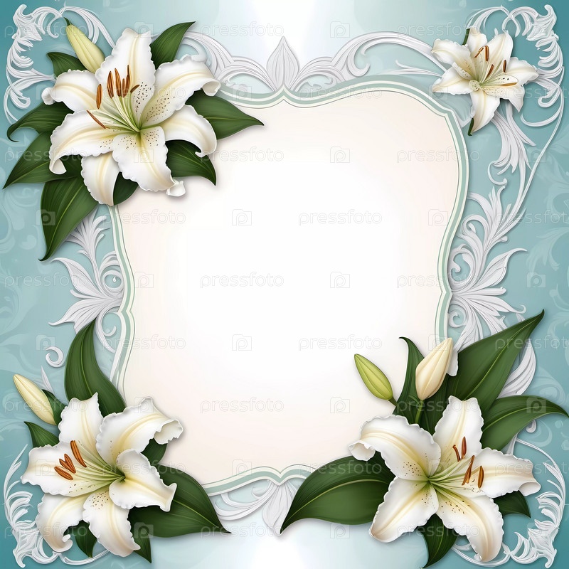 Очаровательные белые лилии с зелеными листьями создают нежную границу вокруг пустого пространства, идеально подходящую для добавления персонализированных сообщений или дизайнов. Генеративное искусство ИИ. Копировальное пространство, поздравительная открыт