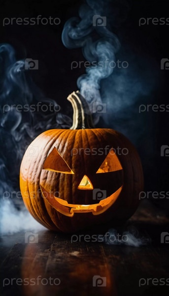 Вырезанная тыква на Хэллоуин имеет угрожающее лицо, подсвеченное изнутри, с дымом, поднимающимся вверх, что усиливает тревожную атмосферу вечера. Генеративный ИИ