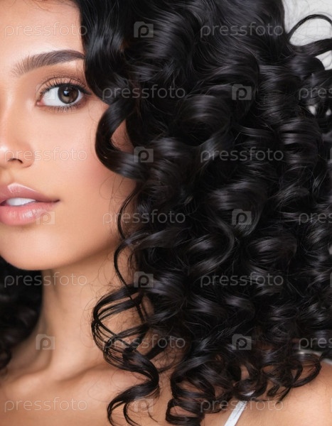 Сияющие кудри обрамляют молодое лицо, демонстрируя великолепные черные, блестящие волосы с четко очерченными спиралями. Мягкий свет подчеркивает текстуру и глубину локонов, создавая потрясающий вид. Генеративный ИИ