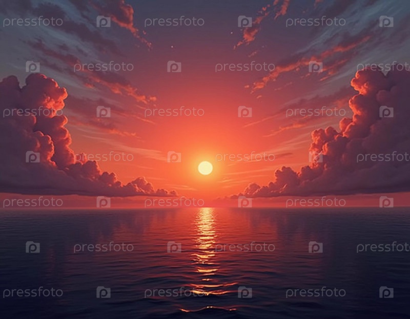 Потрясающий восход солнца омывает океан ярким красным светом, а облака отражают цвета над ним. Волны мягко омывают берег, создавая умиротворяющую атмосферу на рассвете. Влажная дымка над водой. Генеративный ИИ