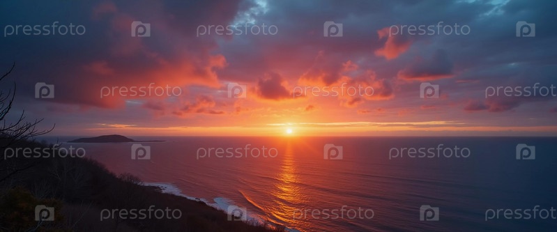 Потрясающий восход солнца омывает океан ярким красным светом, а облака отражают цвета над ним. Волны мягко омывают берег, создавая умиротворяющую атмосферу на рассвете. Влажная дымка над водой. Генеративный ИИ