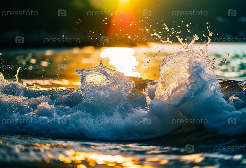 Когда солнце садится, морские волны разбиваются о берег, создавая красивый всплеск. Небо окрашено в теплые цвета, отражаясь на поверхности океана. Морской природный ландшафт. Генеративный ИИ