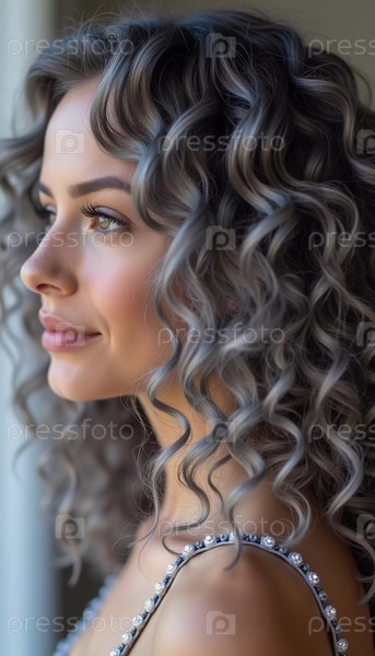 Поразительный крупный план показывает роскошные седые пепельные локоны, сверкающие блеском. Мягкие волны элегантно ниспадают, подчеркивая текстуру и красоту волос в мягком естественном свете. Генеративный ИИ