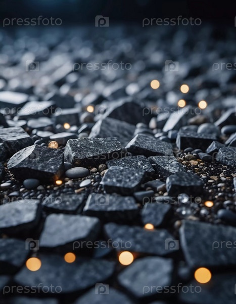 Сложные узоры из темной гранитной крошки, освещенные тонким светом, создающим спокойную и элегантную атмосферу. Черный измельченный минерал сверкает. Боке или капли. Генеративный ИИ