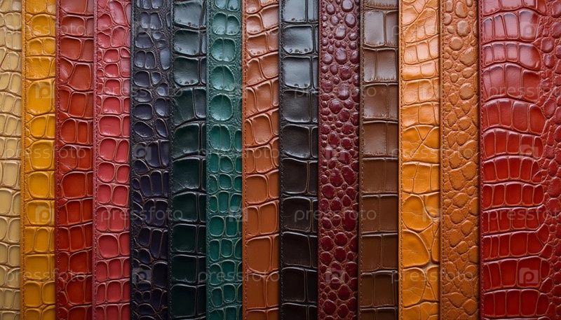 Различные образцы натуральной крокодиловой кожи представлены в ярких цветах. Каждый экземпляр демонстрирует уникальные текстуры и отделки, привлекательные для любителей кожи и дизайнеров. Генеративный ИИ