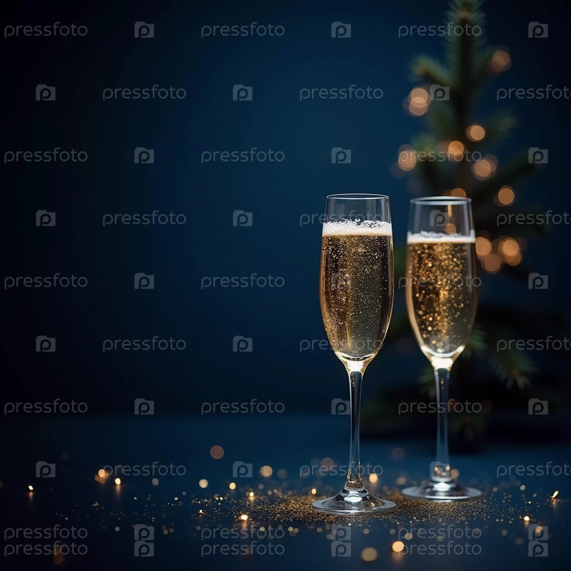 Два сверкающих бокала шампанского элегантно стоят на фоне украшенной рождественской елки, передавая дух праздника золотым мерцанием. Генеративный ИИ