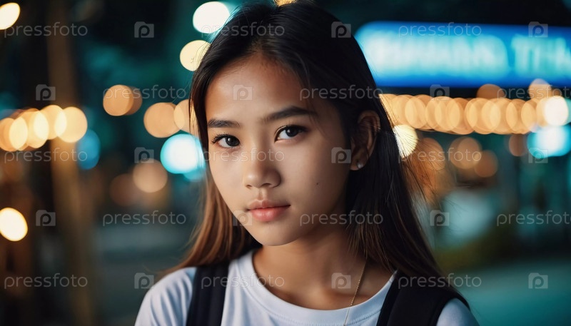 Жительница Таиланда стоит неподвижно, ее длинные волосы обрамляют лицо, на фоне теплых светящихся огней на оживленной улице вечером. Генеративный ИИ