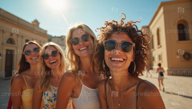 Друзья исследуют очаровательное средиземноморское место, разделяя радостные моменты и смех, греясь на теплом летнем солнце и любуясь потрясающей архитектурой. Красивые молодые девушки. Генеративный ИИ