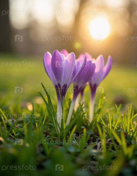Нежные розовые цветы крокуса цветут на сочной зеленой траве, солнечный свет в безмятежной весенней обстановке. Возрождение природы. Шафрановый крокус — род многолетних луковичных травянистых растений семейства Ирисовые. AI