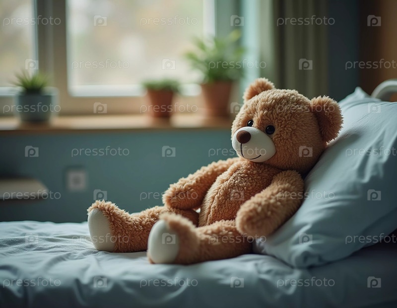 Мягкий плюшевый мишка сидит на больничной койке, даря утешение и надежду ребенку, идущему на поправку. Теплые тона мишки контрастируют с безмятежной обстановкой, усиливая атмосферу. Генеративный ИИ