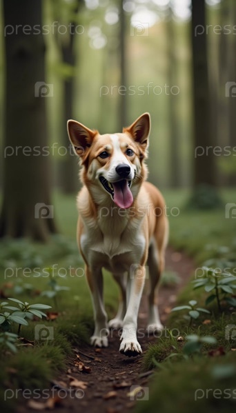 В тихом лесу счастливая собака прогуливается по узкой тропинке, яркая зелень и возвышающиеся деревья создают умиротворяющий фон, запечатлевающий суть красоты природы AI
