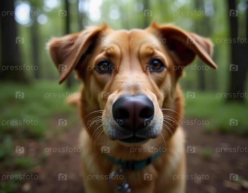Золотая собака смотрит прямо на зрителя среди пышной зелени спокойного леса. Ее глаза отражают любопытство и игривость, когда она стоит на мягкой, земляной тропе, окруженной возвышающимися деревьями AI