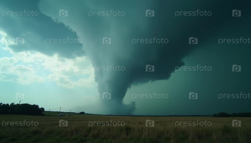 Мощный торнадо спускается из зловещих грозовых облаков, извиваясь и кружась над равнинной местностью. Небо темнеет, намекая на свирепость приближающейся бури Генеративный ИИ