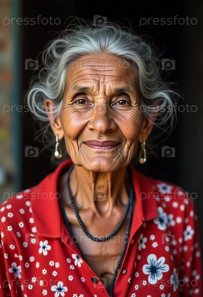 Добрая пожилая женщина из Индии стоит на деревенском фоне, ее цветочное одеяние и нежная улыбка источают ощущение тепла и культурного наследия. Очарование возраста очевидно