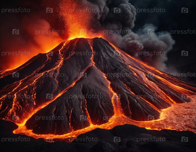 Из величественного вулкана извергается лава, выбрасывая на темное небо яркие оранжевые языки пламени, а густой дым поднимается вверх, демонстрируя неистовую силу природы