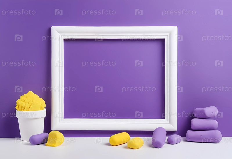 Красочные композиции из пластилина Play Doh демонстрируют креативность: белая прямоугольная рамка на ярком фиолетовом фоне, желтые и фиолетовые фигуры и контейнер