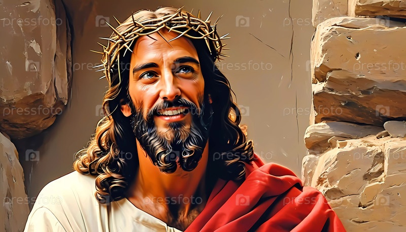 В спокойной обстановке, наполненной древними каменными стенами, улыбающийся Иисус Христос излучает тепло и радость Генеративный ИИ