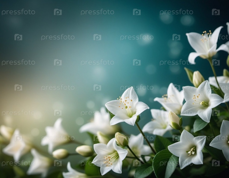 Белые колокольчики цветут в пышном зеленом лесу. Яркий контраст на фоне богатой листвы. Красивая природная сцена. Нечеткий фон. Глубина и спокойствие. Создано с помощью ИИ. Скопируйте место для текста