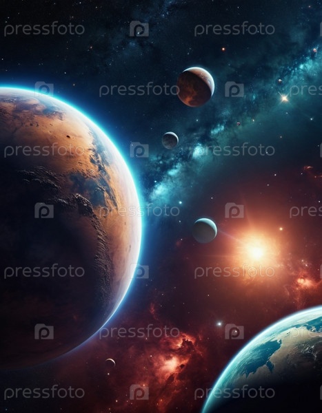 Планетарная система с несколькими планетами, большим ярко окрашенным газовым гигантом и каменистой планетой. Яркие звезды и огромное пространство темного космоса с галактикой на заднем плане. Космические просторы. Космонавтика. ИИ