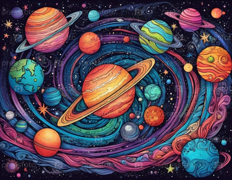 Планетарная система с несколькими планетами, большим ярко окрашенным газовым гигантом и каменистой планетой. Яркие звезды и огромное пространство темного космоса с галактикой на заднем плане. Космические просторы. Космонавтика. ИИ