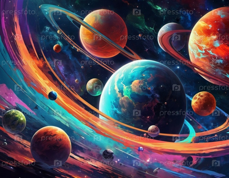 Планетарная система с несколькими планетами, большим ярко окрашенным газовым гигантом и каменистой планетой. Яркие звезды и огромное пространство темного космоса с галактикой на заднем плане. Космические просторы. Космонавтика. ИИ