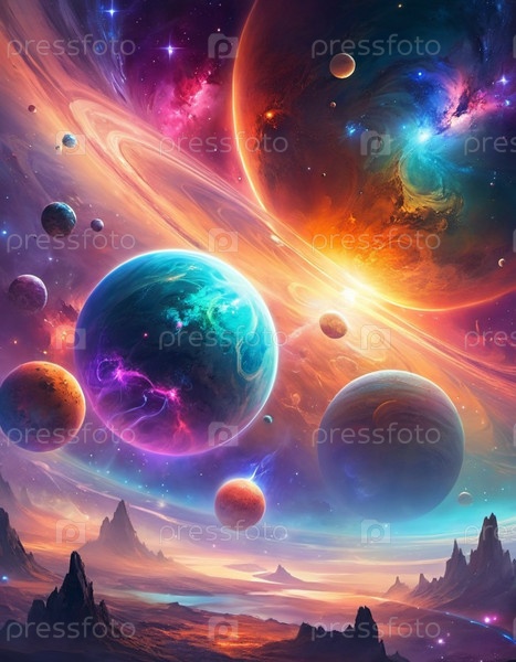 Планетарная система с несколькими планетами, большим ярко окрашенным газовым гигантом и каменистой планетой. Яркие звезды и огромное пространство темного космоса с галактикой на заднем плане. Космические просторы. Космонавтика. ИИ