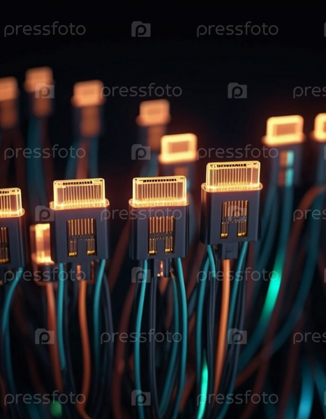 Синие и оранжевые светящиеся провода скручиваются и переплетаются на темном фоне с боке-огнями. Черные кабели и разъемы со светящимися огнями и цепями соединяются, образуя сеть. Создано с помощью ИИ
