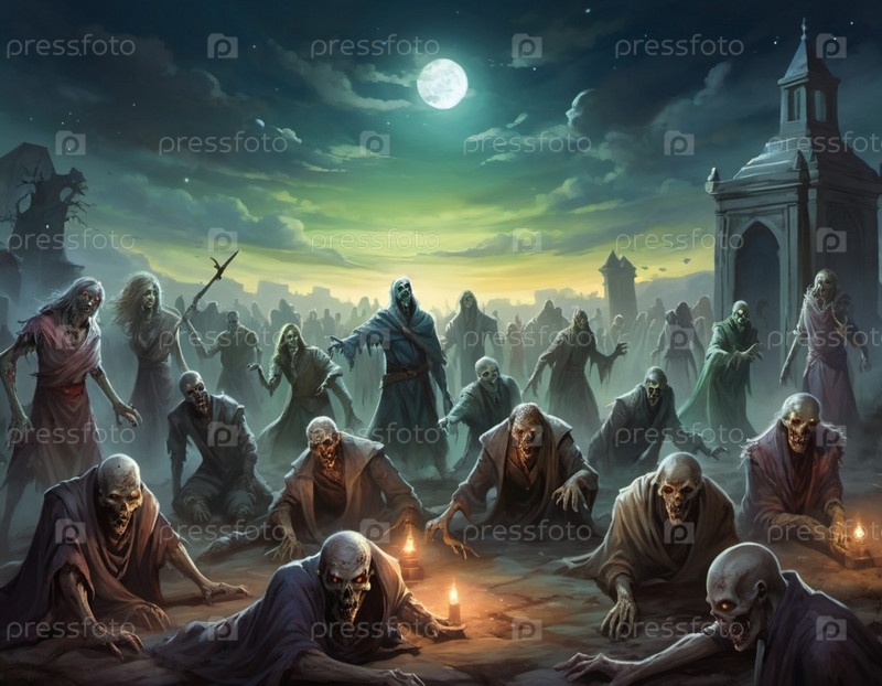 Гротескные зомби появляются из могил, разложившиеся тела освещаются лунным светом. Скелетные фигуры бродят среди надгробий, в то время как другие ползают по земле, демонстрируя свой ужасный вид. ИИ