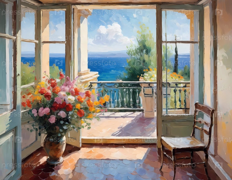 Летний вид с балкона с цветущими цветами, умиротворяющая сцена природы и яркое солнце, располагающее к отдыху и наслаждению живописным пейзажем, полным зелени и далекой воды. AI