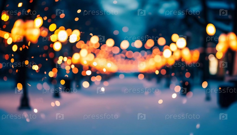 Зима приносит мягкий снегопад на городские улицы, где разноцветные огни висят над головой, создавая теплую и праздничную атмосферу. Эффект боке от огней добавляет причудливый штрих, подчеркивая радость сезона