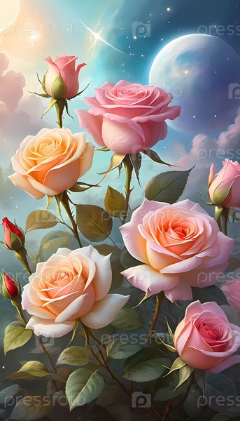 Потрясающая романтическая картина с изящными розовыми и персиковыми розами, цветущими под мягким небесным небом, с лучистым закатом, освещающим сцену. Луна и звезды, вызывающие чувство безмятежности и любви. AI